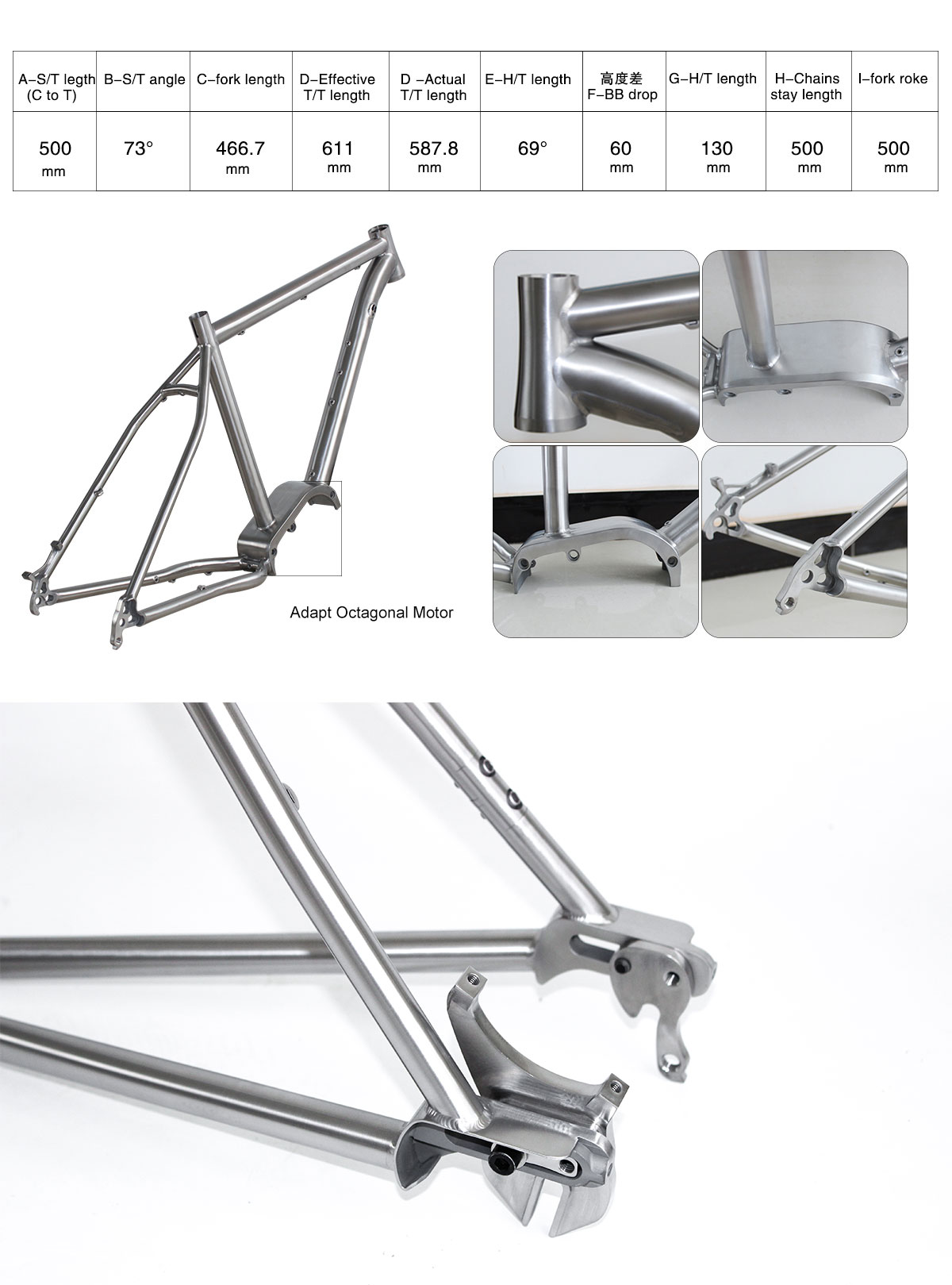 Specifications for : Titanium E Bike Frame with Bafang G510 m600 motor